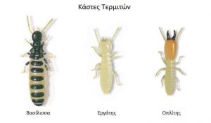 Οι τερμίτες ζουν σε αποικίες, στις οποίες συναντάμε 3 βασικές ομάδες, γνωστές ως κάστες:
